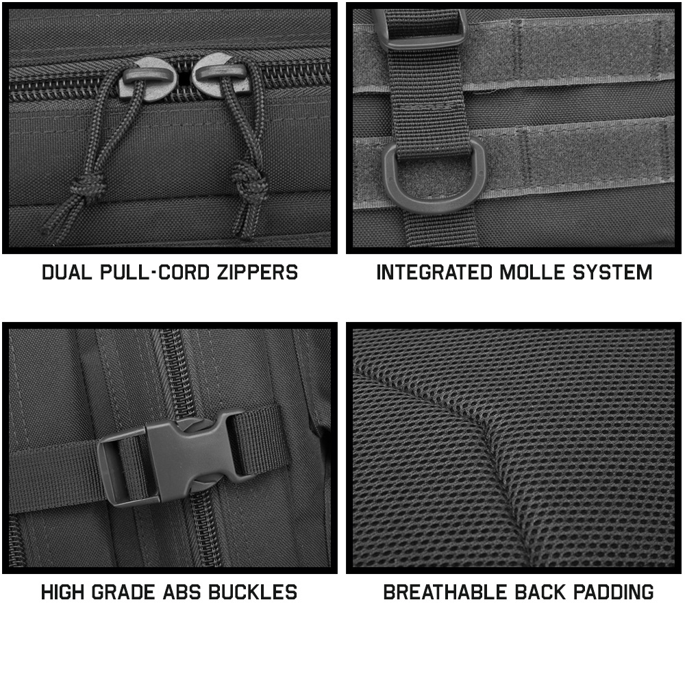 • Multipurpose: The perfect 3 day assault pack and combat molle backpack; a great outdoor EDC pack, conceal carry bag and gun range bag for handguns and ammo.